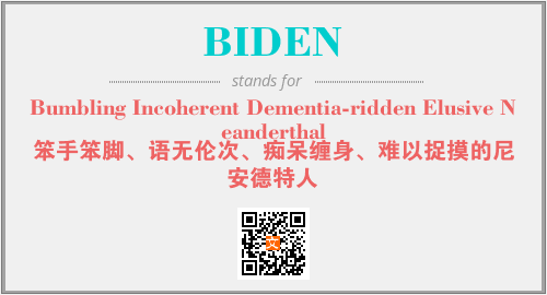 英文缩略词“BIDEN”经常作为“Bumbling Incoherent Dementia-ridden Elusive Neanderthal”的英文缩写来使用,中文表示:“笨手笨脚、语无伦次、痴呆缠身、难以捉摸的尼安德特人”。本文将详细介绍英文缩写词BIDEN所代表英文单词,其对应的中文拼音、详细解释以及在英语中的流行度。此外,还有关于缩略词BIDEN的分类、应用领域及相关应用示例等。