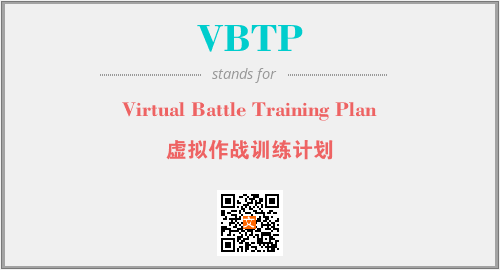 上述内容是“Virtual Battle Training Plan”作为“VBTP”的缩写,解释为“虚拟作战训练计划”时的信息,以及英文缩略词VBTP所代表的英文单词,其对应的中文拼音、详细解释以及在英文中的流行度和相关分类、应用领域及应用示例等。