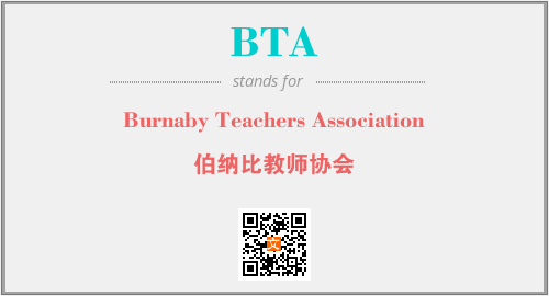 上述内容是“Burnaby Teachers Association”作为“BTA”的缩写,解释为“伯纳比教师协会”时的信息,以及英文缩略词BTA所代表的英文单词,其对应的中文拼音、详细解释以及在英文中的流行度和相关分类、应用领域及应用示例等。