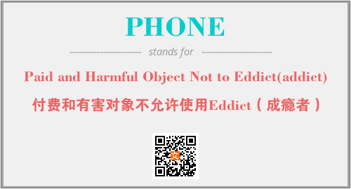 上述内容是“Paid and Harmful Object Not to Eddict(addict)”作为“PHONE”的缩写,解释为“付费和有害对象不允许使用Eddict(成瘾者)”时的信息,以及英文缩略词PHONE所代表的英文单词,其对应的中文拼音、详细解释以及在英文中的流行度和相关分类、应用领域及应用示例等。