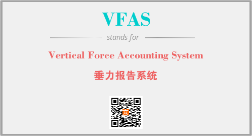 英文缩略词“VFAS”经常作为“Vertical Force Accounting System”的英文缩写来使用,中文表示:“垂力报告系统”。本文将详细介绍英文缩写词VFAS所代表英文单词,其对应的中文拼音、详细解释以及在英语中的流行度。此外,还有关于缩略词VFAS的分类、应用领域及相关应用示例等。
