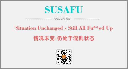 上述内容是“Situation Unchanged - Still All Fu**ed Up”作为“SUSAFU”的缩写,解释为“情况未变-仍处于混乱状态”时的信息,以及英文缩略词SUSAFU所代表的英文单词,其对应的中文拼音、详细解释以及在英文中的流行度和相关分类、应用领域及应用示例等。