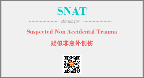 上述内容是“Suspected Non Accidental Trauma”作为“SNAT”的缩写,解释为“疑似非意外创伤”时的信息,以及英文缩略词SNAT所代表的英文单词,其对应的中文拼音、详细解释以及在英文中的流行度和相关分类、应用领域及应用示例等。