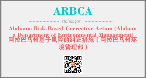 英文缩略词“ARBCA”经常作为“Alabama Risk-Based Corrective Action (Alabama Department of Environmental Management)”的英文缩写来使用,中文表示:“阿拉巴马州基于风险的纠正措施(阿拉巴马州环境管理部)”。本文将详细介绍英文缩写词ARBCA所代表英文单词,其对应的中文拼音、详细解释以及在英语中的流行度。此外,还有关于缩略词ARBCA的分类、应用领域及相关应用示例等。