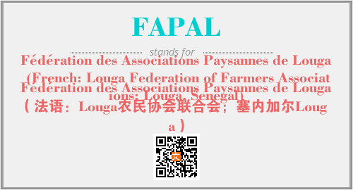 上述内容是“Fédération des Associations Paysannes de Louga (French: Louga Federation of Farmers Associations; Louga, Senegal)”作为“FAPAL”的缩写,解释为“Fédération des Associations Paysannes de Louga(法语:Louga农民协会联合会;塞内加尔Louga)”时的信息,以及英文缩略词FAPAL所代表的英文单词,其对应的中文拼音、详细解释以及在英文中的流行度和相关分类、应用领域及应用示例等。