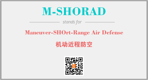 英文缩略词“M-SHORAD”经常作为“Maneuver-SHOrt-Range Air Defense”的英文缩写来使用,中文表示:“机动近程防空”。本文将详细介绍英文缩写词M-SHORAD所代表英文单词,其对应的中文拼音、详细解释以及在英语中的流行度。此外,还有关于缩略词M-SHORAD的分类、应用领域及相关应用示例等。