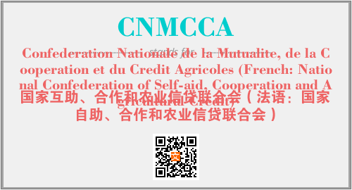 上述内容是“Confederation Nationale de la Mutualite, de la Cooperation et du Credit Agricoles (French: National Confederation of Self-aid, Cooperation and Agricultural Credit)”作为“CNMCCA”的缩写,解释为“国家互助、合作和农业信贷联合会(法语:国家自助、合作和农业信贷联合会)”时的信息,以及英文缩略词CNMCCA所代表的英文单词,其对应的中文拼音、详细解释以及在英文中的流行度和相关分类、应用领域及应用示例等。