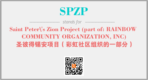 上述内容是“Saint Peter\'s Zion Project (part of: RAINBOW COMMUNITY ORGANIZATION, INC)”作为“SPZP”的缩写,解释为“圣彼得锡安项目(彩虹社区组织的一部分)”时的信息,以及英文缩略词SPZP所代表的英文单词,其对应的中文拼音、详细解释以及在英文中的流行度和相关分类、应用领域及应用示例等。