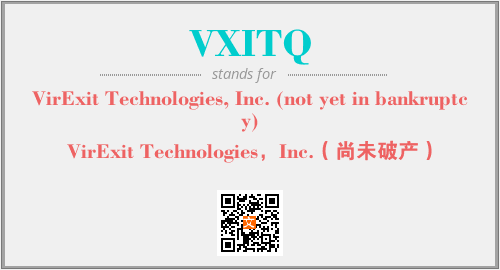上述内容是“VirExit Technologies, Inc. (not yet in bankruptcy)”作为“VXITQ”的缩写,解释为“VirExit Technologies,Inc.(尚未破产)”时的信息,以及英文缩略词VXITQ所代表的英文单词,其对应的中文拼音、详细解释以及在英文中的流行度和相关分类、应用领域及应用示例等。