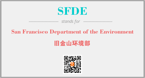 英文缩略词“SFDE”经常作为“San Francisco Department of the Environment”的英文缩写来使用,中文表示:“旧金山环境部”。本文将详细介绍英文缩写词SFDE所代表英文单词,其对应的中文拼音、详细解释以及在英语中的流行度。此外,还有关于缩略词SFDE的分类、应用领域及相关应用示例等。