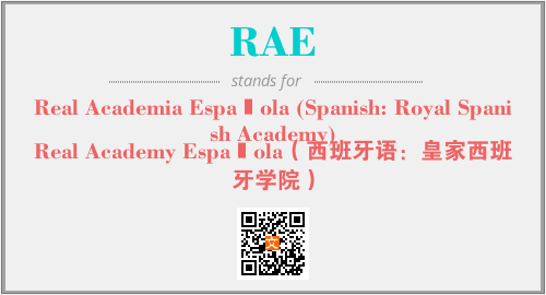 上述内容是“Real Academia Española (Spanish: Royal Spanish Academy)”作为“RAE”的缩写,解释为“Real Academy Española(西班牙语:皇家西班牙学院)”时的信息,以及英文缩略词RAE所代表的英文单词,其对应的中文拼音、详细解释以及在英文中的流行度和相关分类、应用领域及应用示例等。