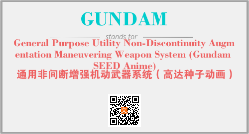 英文缩略词“GUNDAM”经常作为“General Purpose Utility Non-Discontinuity Augmentation Maneuvering Weapon System (Gundam SEED Anime)”的英文缩写来使用,中文表示:“通用非间断增强机动武器系统(高达种子动画)”。本文将详细介绍英文缩写词GUNDAM所代表英文单词,其对应的中文拼音、详细解释以及在英语中的流行度。此外,还有关于缩略词GUNDAM的分类、应用领域及相关应用示例等。
