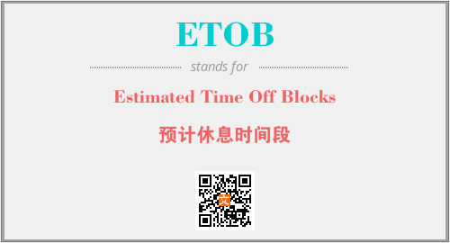 上述内容是“Estimated Time Off Blocks”作为“ETOB”的缩写,解释为“预计休息时间段”时的信息,以及英文缩略词ETOB所代表的英文单词,其对应的中文拼音、详细解释以及在英文中的流行度和相关分类、应用领域及应用示例等。