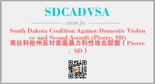 上述内容是“South Dakota Coalition Against Domestic Violence and Sexual Assault (Pierre, SD)”作为“SDCADVSA”的缩写,解释为“南达科他州反对家庭暴力和性攻击联盟(Pierre,SD)”时的信息,以及英文缩略词SDCADVSA所代表的英文单词,其对应的中文拼音、详细解释以及在英文中的流行度和相关分类、应用领域及应用示例等。