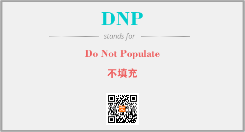 英文缩略词“DNP”经常作为“Do Not Populate”的英文缩写来使用,中文表示:“不填充”。本文将详细介绍英文缩写词DNP所代表英文单词,其对应的中文拼音、详细解释以及在英语中的流行度。此外,还有关于缩略词DNP的分类、应用领域及相关应用示例等。
