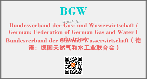 上述内容是“Bundesverband der Gas- und Wasserwirtschaft (German: Federation of German Gas and Water Industries)”作为“BGW”的缩写,解释为“Bundesverband der Gas-und Wasserwirtschaft(德语:德国天然气和水工业联合会)”时的信息,以及英文缩略词BGW所代表的英文单词,其对应的中文拼音、详细解释以及在英文中的流行度和相关分类、应用领域及应用示例等。