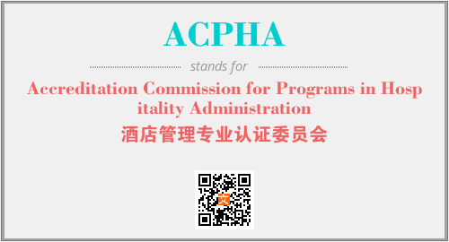 英文缩略词“ACPHA”经常作为“Accreditation Commission for Programs in Hospitality Administration”的英文缩写来使用,中文表示:“酒店管理专业认证委员会”。本文将详细介绍英文缩写词ACPHA所代表英文单词,其对应的中文拼音、详细解释以及在英语中的流行度。此外,还有关于缩略词ACPHA的分类、应用领域及相关应用示例等。