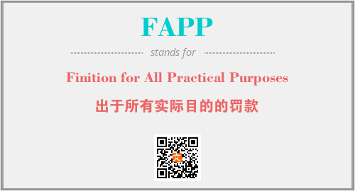 上述内容是“Finition for All Practical Purposes”作为“FAPP”的缩写,解释为“出于所有实际目的的罚款”时的信息,以及英文缩略词FAPP所代表的英文单词,其对应的中文拼音、详细解释以及在英文中的流行度和相关分类、应用领域及应用示例等。