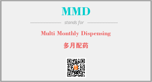英文缩略词“MMD”经常作为“Multi Monthly Dispensing”的英文缩写来使用,中文表示:“多月配药”。本文将详细介绍英文缩写词MMD所代表英文单词,其对应的中文拼音、详细解释以及在英语中的流行度。此外,还有关于缩略词MMD的分类、应用领域及相关应用示例等。