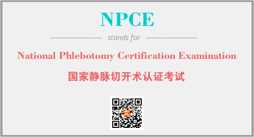 上述内容是“National Phlebotomy Certification Examination”作为“NPCE”的缩写,解释为“国家静脉切开术认证考试”时的信息,以及英文缩略词NPCE所代表的英文单词,其对应的中文拼音、详细解释以及在英文中的流行度和相关分类、应用领域及应用示例等。