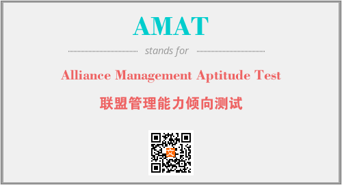上述内容是“Alliance Management Aptitude Test”作为“AMAT”的缩写,解释为“联盟管理能力倾向测试”时的信息,以及英文缩略词AMAT所代表的英文单词,其对应的中文拼音、详细解释以及在英文中的流行度和相关分类、应用领域及应用示例等。