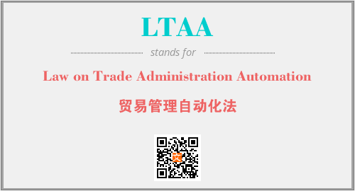 英文缩略词“LTAA”经常作为“Law on Trade Administration Automation”的英文缩写来使用,中文表示:“贸易管理自动化法”。本文将详细介绍英文缩写词LTAA所代表英文单词,其对应的中文拼音、详细解释以及在英语中的流行度。此外,还有关于缩略词LTAA的分类、应用领域及相关应用示例等。