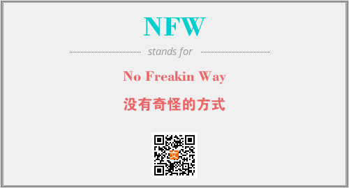 上述内容是“No Freakin Way”作为“NFW”的缩写,解释为“没有奇怪的方式”时的信息,以及英文缩略词NFW所代表的英文单词,其对应的中文拼音、详细解释以及在英文中的流行度和相关分类、应用领域及应用示例等。