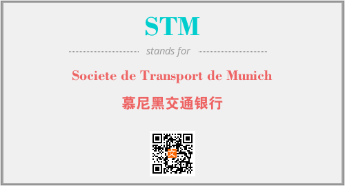 上述内容是“Societe de Transport de Munich”作为“STM”的缩写,解释为“慕尼黑交通银行”时的信息,以及英文缩略词STM所代表的英文单词,其对应的中文拼音、详细解释以及在英文中的流行度和相关分类、应用领域及应用示例等。