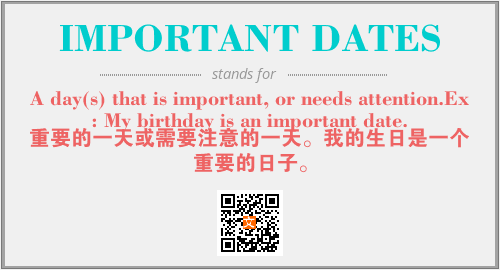 以上为A day(s) that is important, or needs attention.Ex: My birthday is an important date.英文缩略词IMPORTANT DATES的中文解释,以及该英文缩写在英语的流行度、分类和应用领域方面的信息。
