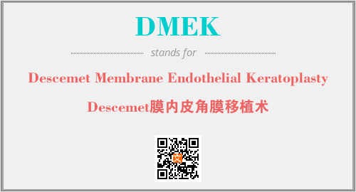 上述内容是“Descemet Membrane Endothelial Keratoplasty”作为“DMEK”的缩写,解释为“Descemet膜内皮角膜移植术”时的信息,以及英文缩略词DMEK所代表的英文单词,其对应的中文拼音、详细解释以及在英文中的流行度和相关分类、应用领域及应用示例等。