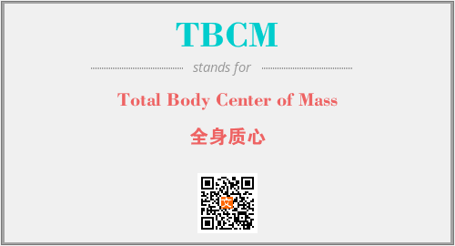 英文缩略词“TBCM”经常作为“Total Body Center of Mass”的英文缩写来使用,中文表示:“全身质心”。本文将详细介绍英文缩写词TBCM所代表英文单词,其对应的中文拼音、详细解释以及在英语中的流行度。此外,还有关于缩略词TBCM的分类、应用领域及相关应用示例等。