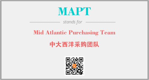 上述内容是“Mid Atlantic Purchasing Team”作为“MAPT”的缩写,解释为“中大西洋采购团队”时的信息,以及英文缩略词MAPT所代表的英文单词,其对应的中文拼音、详细解释以及在英文中的流行度和相关分类、应用领域及应用示例等。