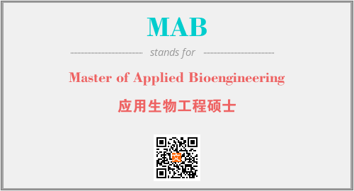 上述内容是“Master of Applied Bioengineering”作为“MAB”的缩写,解释为“应用生物工程硕士”时的信息,以及英文缩略词MAB所代表的英文单词,其对应的中文拼音、详细解释以及在英文中的流行度和相关分类、应用领域及应用示例等。