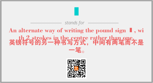 上述内容是“An alternate way of writing the pound sign £, with 2 strokes in the centre rather than one.”作为“₤”的缩写,解释为“英镑符号的另一种书写方式,中间有两笔而不是一笔。”时的信息,以及英文缩略词₤所代表的英文单词,其对应的中文拼音、详细解释以及在英文中的流行度和相关分类、应用领域及应用示例等。
