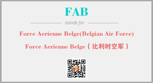 上述内容是“Force Aerienne Belge(Belgian Air Force)”作为“FAB”的缩写,解释为“Force Aerienne Belge(比利时空军)”时的信息,以及英文缩略词FAB所代表的英文单词,其对应的中文拼音、详细解释以及在英文中的流行度和相关分类、应用领域及应用示例等。