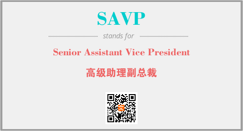 上述内容是“Senior Assistant Vice President”作为“SAVP”的缩写,解释为“高级助理副总裁”时的信息,以及英文缩略词SAVP所代表的英文单词,其对应的中文拼音、详细解释以及在英文中的流行度和相关分类、应用领域及应用示例等。