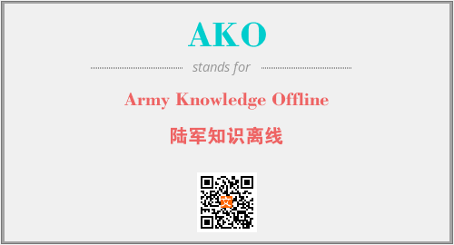 英文缩略词“AKO”经常作为“Army Knowledge Offline”的英文缩写来使用,中文表示:“陆军知识离线”。本文将详细介绍英文缩写词AKO所代表英文单词,其对应的中文拼音、详细解释以及在英语中的流行度。此外,还有关于缩略词AKO的分类、应用领域及相关应用示例等。