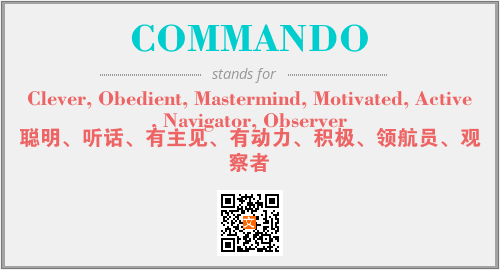 上述内容是“Clever, Obedient, Mastermind, Motivated, Active, Navigator, Observer”作为“COMMANDO”的缩写,解释为“聪明、听话、有主见、有动力、积极、领航员、观察者”时的信息,以及英文缩略词COMMANDO所代表的英文单词,其对应的中文拼音、详细解释以及在英文中的流行度和相关分类、应用领域及应用示例等。