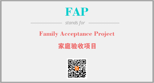 英文缩略词“FAP”经常作为“Family Acceptance Project”的英文缩写来使用,中文表示:“家庭验收项目”。本文将详细介绍英文缩写词FAP所代表英文单词,其对应的中文拼音、详细解释以及在英语中的流行度。此外,还有关于缩略词FAP的分类、应用领域及相关应用示例等。