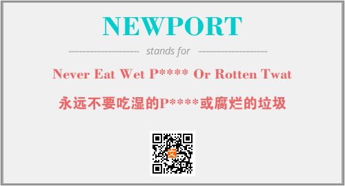 上述内容是“Never Eat Wet P**** Or Rotten Twat”作为“NEWPORT”的缩写,解释为“永远不要吃湿的P****或腐烂的垃圾”时的信息,以及英文缩略词NEWPORT所代表的英文单词,其对应的中文拼音、详细解释以及在英文中的流行度和相关分类、应用领域及应用示例等。