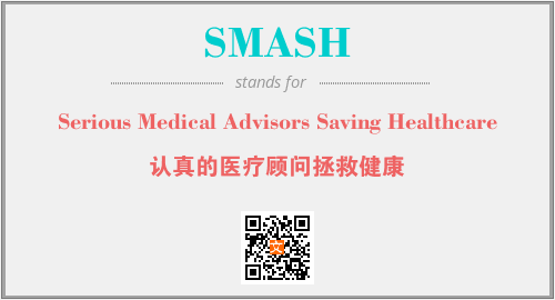 上述内容是“Serious Medical Advisors Saving Healthcare”作为“SMASH”的缩写,解释为“认真的医疗顾问拯救健康”时的信息,以及英文缩略词SMASH所代表的英文单词,其对应的中文拼音、详细解释以及在英文中的流行度和相关分类、应用领域及应用示例等。