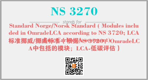 上述内容是“Standard Norge/Norsk Standard ( Modules included in OmradeLCA according to NS 3720; LCA - Low Carbon Assessment)”作为“NS 3270”的缩写,解释为“标准挪威/挪威标准(根据NS 3720,OmradeLCA中包括的模块;LCA-低碳评估)”时的信息,以及英文缩略词NS 3270所代表的英文单词,其对应的中文拼音、详细解释以及在英文中的流行度和相关分类、应用领域及应用示例等。