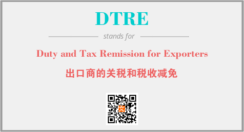 上述内容是“Duty and Tax Remission for Exporters”作为“DTRE”的缩写,解释为“出口商的关税和税收减免”时的信息,以及英文缩略词DTRE所代表的英文单词,其对应的中文拼音、详细解释以及在英文中的流行度和相关分类、应用领域及应用示例等。
