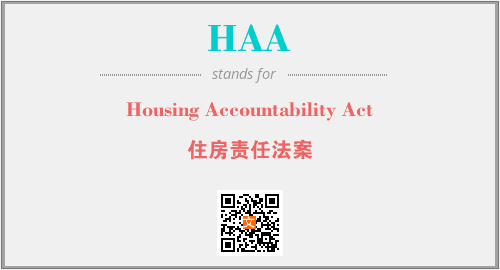 上述内容是“Housing Accountability Act”作为“HAA”的缩写,解释为“住房责任法案”时的信息,以及英文缩略词HAA所代表的英文单词,其对应的中文拼音、详细解释以及在英文中的流行度和相关分类、应用领域及应用示例等。