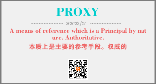 上述内容是“A means of reference which is a Principal by nature. Authoritative.”作为“PROXY”的缩写,解释为“本质上是主要的参考手段。权威的”时的信息,以及英文缩略词PROXY所代表的英文单词,其对应的中文拼音、详细解释以及在英文中的流行度和相关分类、应用领域及应用示例等。