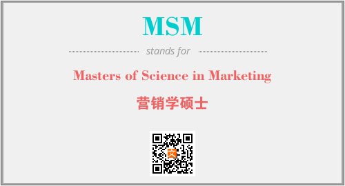 英文缩略词“MSM”经常作为“Masters of Science in Marketing”的英文缩写来使用,中文表示:“营销学硕士”。本文将详细介绍英文缩写词MSM所代表英文单词,其对应的中文拼音、详细解释以及在英语中的流行度。此外,还有关于缩略词MSM的分类、应用领域及相关应用示例等。