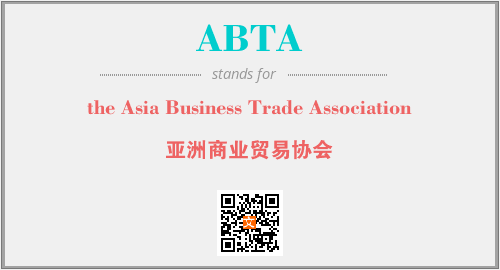 英文缩略词“ABTA”经常作为“the Asia Business Trade Association”的英文缩写来使用,中文表示:“亚洲商业贸易协会”。本文将详细介绍英文缩写词ABTA所代表英文单词,其对应的中文拼音、详细解释以及在英语中的流行度。此外,还有关于缩略词ABTA的分类、应用领域及相关应用示例等。