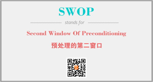 上述内容是“Second Window Of Preconditioning”作为“SWOP”的缩写,解释为“预处理的第二窗口”时的信息,以及英文缩略词SWOP所代表的英文单词,其对应的中文拼音、详细解释以及在英文中的流行度和相关分类、应用领域及应用示例等。