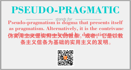 上述内容是“Pseudo-pragmatism is dogma that presents itself as pragmatism. Alternatively, it is the contrivance of pragmatism underlied by dogmatic tenets.”作为“PSEUDO-PRAGMATIC”的缩写,解释为“伪实用主义是实用主义的教条。或者,它是以教条主义信条为基础的实用主义的发明。”时的信息,以及英文缩略词PSEUDO-PRAGMATIC所代表的英文单词,其对应的中文拼音、详细解释以及在英文中的流行度和相关分类、应用领域及应用示例等。