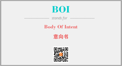 上述内容是“Body Of Intent”作为“BOI”的缩写,解释为“意向书”时的信息,以及英文缩略词BOI所代表的英文单词,其对应的中文拼音、详细解释以及在英文中的流行度和相关分类、应用领域及应用示例等。